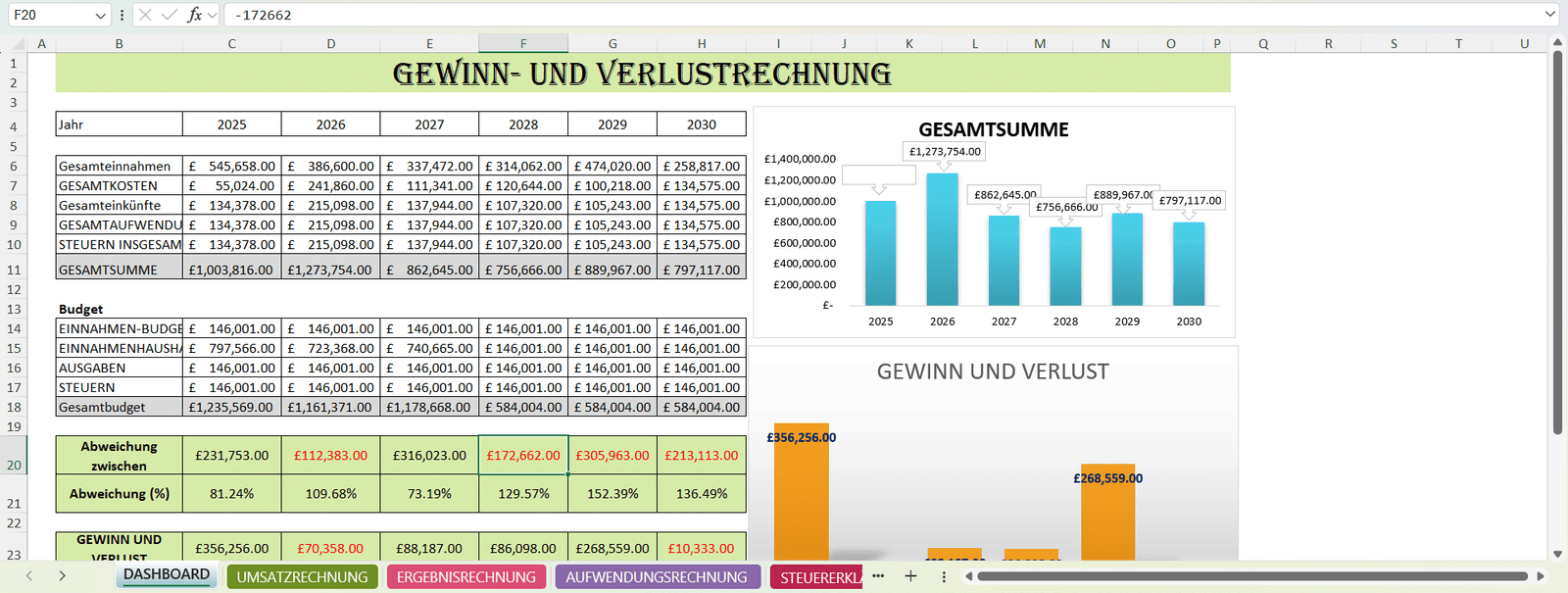 Mit unserer kostenlosen Excel-Vorlage für die Gewinn- und Verlustrechnung kannst du deine Unternehmenszahlen einfach, klar und professionell darstellen. Ideal für kleine und mittlere Unternehmen, Freiberufler und Selbständige, die ihre Finanzen im Blick behalten wollen.