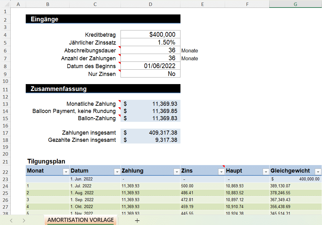 - 3. Das Blatt berechnet automatisch die monatlichen Raten und zeigt Ihnen, wie sich Ihre Restschuld entwickelt.